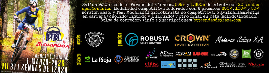 La VII BTT Sendas de Isasa by Chiruca se celebrará el domingo 1 de marzo de 2026 en Arnedo (La Rioja), consolidándose un año más como una de las pruebas de BTT más exigentes, técnicas y espectaculares del calendario riojano.